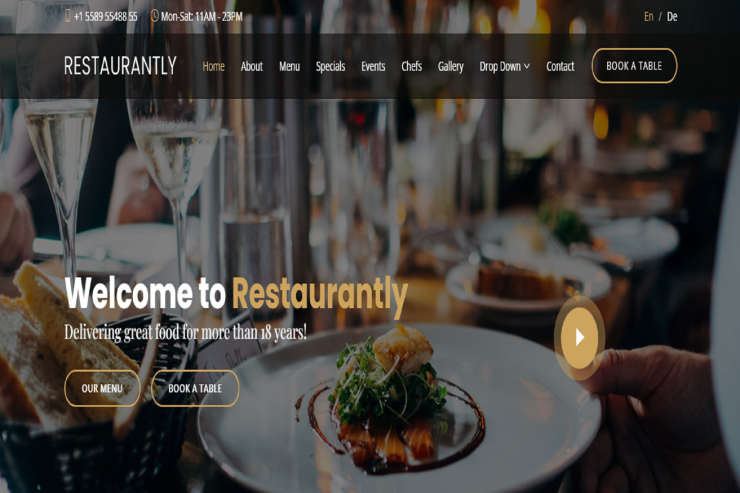Restaurantly is a free Bootstrap 5 responsive template. It’s built for hotels, bakeries, cafes, bars, catering services, food businesses, and other food-related websites, and it’s elegantly styled in dark mode. It’s fully responsive and compatible with all platforms and screen sizes. It’s easy to customize for its clean and well-organized code structure.
